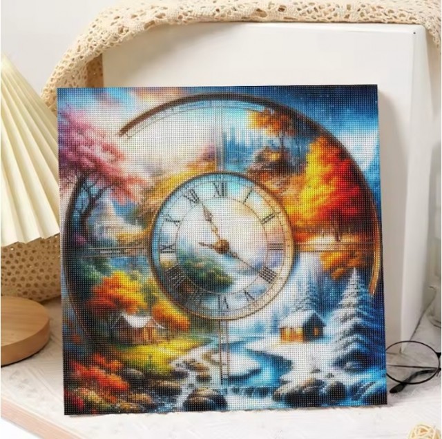 Flott Diamond Painting sett - Årstidens klokke!. Hele motivet på 50x50 cm perles med kvadratiske steiner i 45 farger for et detaljert og levende resultat. Settet inkluderer verktøy og norsk instruksjon – perfekt for timevis med kreativt håndarbeid.