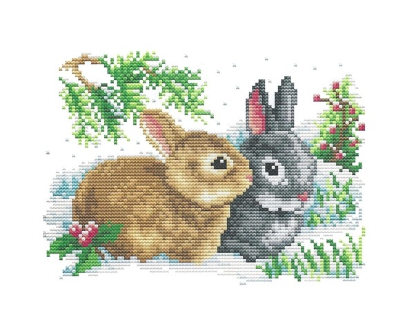 Nydelig korsstings motiv - To kaniner- der broderes for hånd. Settet inneholder 14CT Aida-stoff (5,4 ruter/sting per cm) og måler 26x19 cm med trykt motiv, samt nåler, mønster og garn – alt du trenger for å komme i gang!